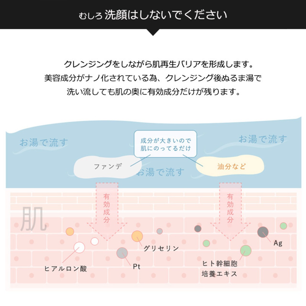 美容成分がナノ化されているためクレンジング後ぬるま湯でさっと流しても肌の奥に有効成分だけが残ります。